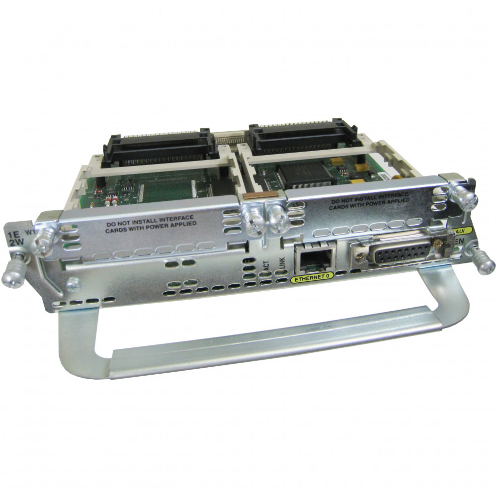 This mixed-media network module has one Ethernet port and two user-configurable WAN Interface Card (WIC) expansion slots. The Ethernet connection is via an Ethernet AUI DB-15 connector or 10BaseT RJ-45 connector. The supported WICs include the 1-port serial (WIC-1T), 1-port ISDN BRI with ST and U interfaces (WIC-1B-S/T, WIC-1B-U), 1-port 56 kbps DSU/CSU (WIC-1DSU-56K4), and 1-port T1/FT1 DSU/CSU (WIC-1DSU-T1).